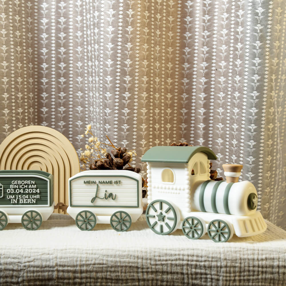 Feiere den einzigartigen Moment der Geburt mit einem ganz individuellen Zug zur Geburt. Einem liebevoll gestalteten, personalisierbaren Unikat, das Erinnerungen sichtbar macht und als besonderes Andenken für immer bleibt. Dieser originelle Zug wird nach deinen Wünschen gefertigt und eignet sich perfekt als Geschenk zur Geburt, zur Babyparty, für’s Kinderzimmer oder als liebevolles Geschenk zur Taufe.Einzigartig personalisierbar